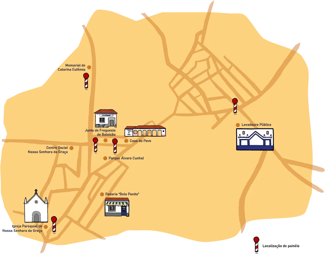 A este conjunto de painéis foi associado um QRCODE que direcionará os visitantes para esta plataforma online onde poderão ser escutados vários testemunhos recolhidos juntos da população sobre os acontecimentos e os personagens que percorrem estas narrativas.